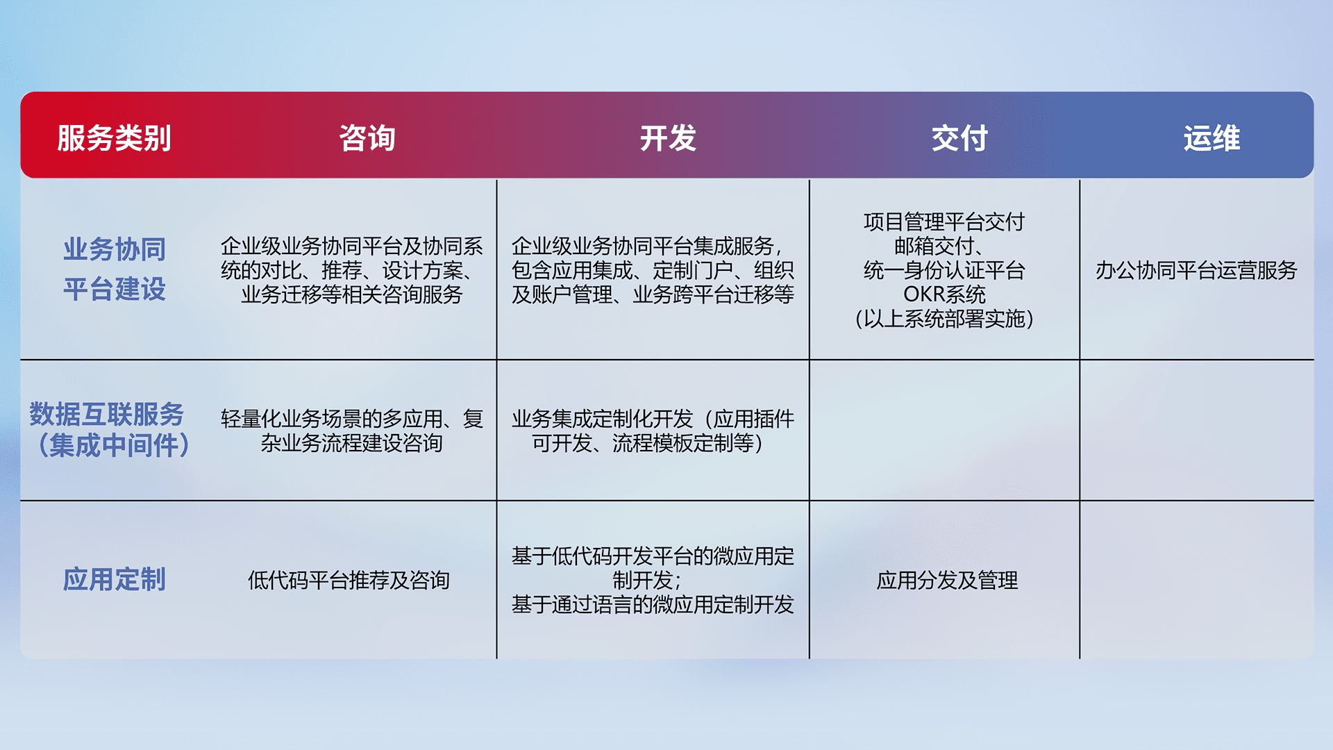 针对钉钉、、企微、、、IDaas等平台级产品提供产品的规划、、方案、、、、交付、、、、定制化开发等服务,,实现如统一协同办公、、、智能客户服务、、混合会议管理、、、、智能数据查询、、、等业务场景,,,实现数字化转型。。。